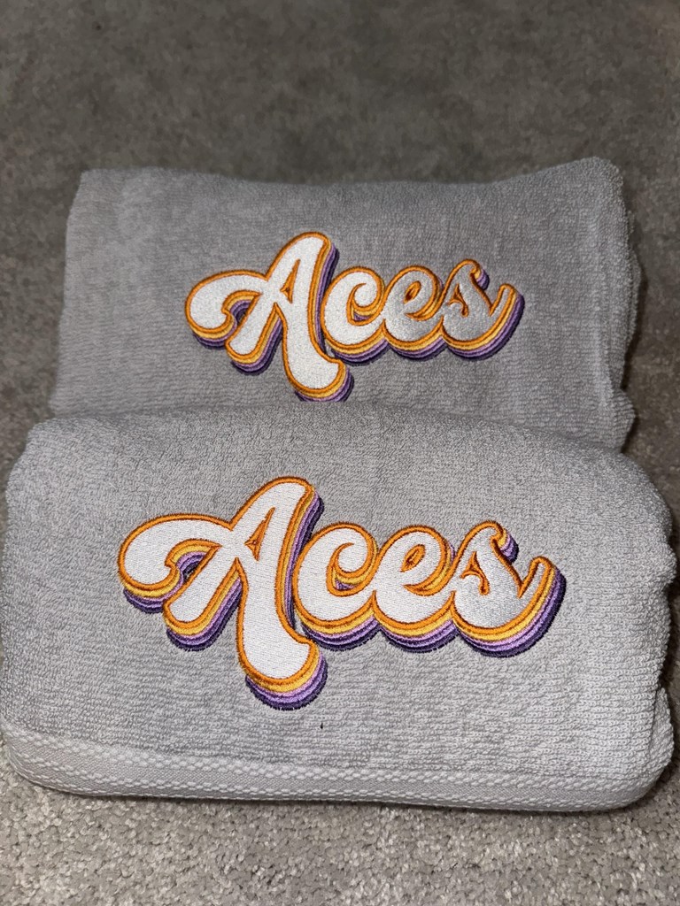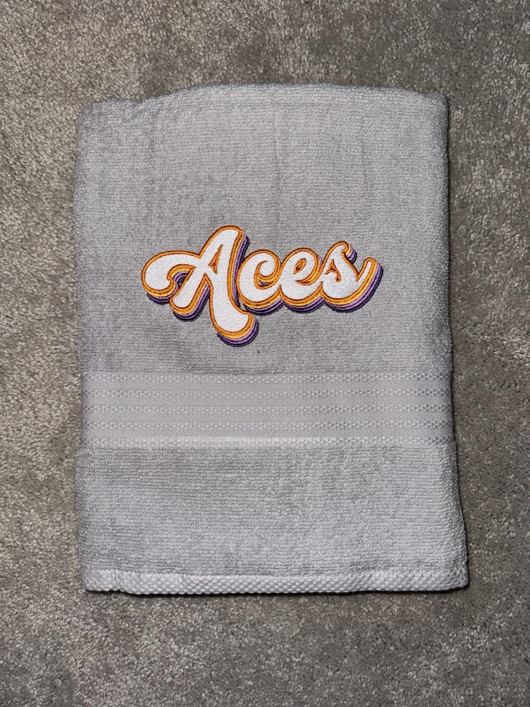 Be the talk of any workout or deck out your bathroom with these 2 one of a kind light Grey Embroidered ACES body towels measuring 27 x 54.