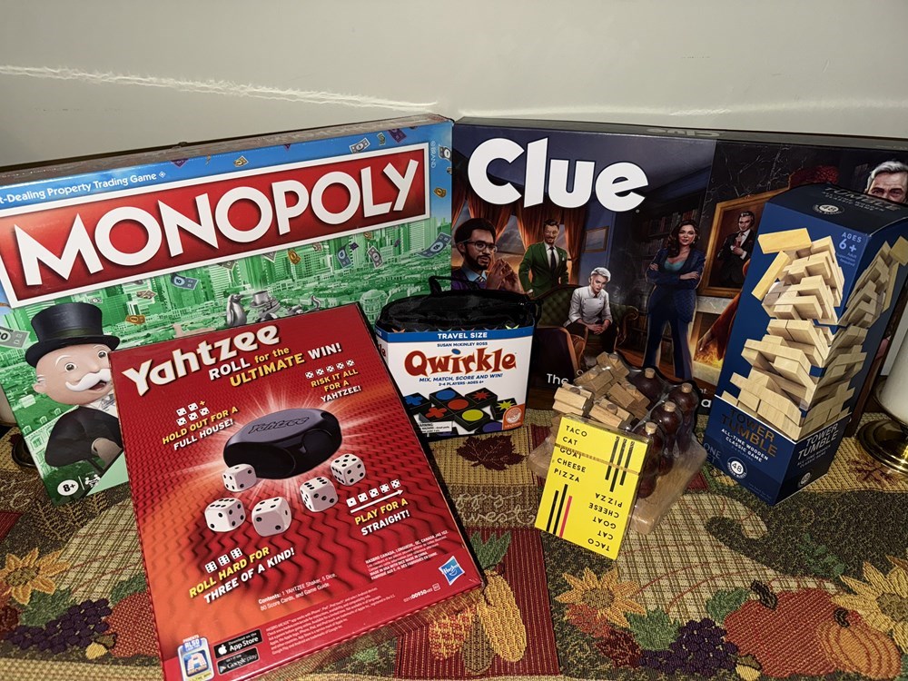 Put down those phones or text books and call on your friends and family to enjoy a good old fashioned time playing games together. This basket is full of games for all ages and includes: Monopoly, Clue, Qwirkle, Jenga, X's & O's, Tri Tac Toe, Shashibo shape shifting box and Taco, Cat, Goat, Cheese Pizza card game.