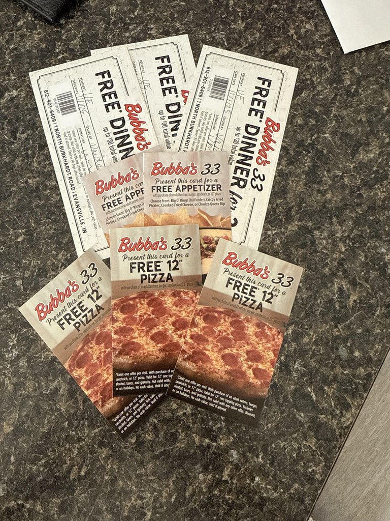 $170 in Bubba's 33 VIP Food Vouchers: 3 free dinners for 2 (up to $30.00 each), 3 Free Pizzas, & 2 Free Appetizers (Restrictions apply; limit 1 offer per visit, expires 90 days after 11/8/25).
