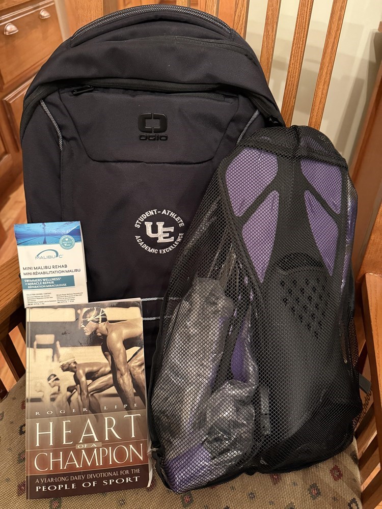 Swimmer inspired backpack, adult zenoplige snorkel set, athlete devotion book, mini Malibu rehab sample Michael Phelps framed quote, retro radio/speaker & Aces swim cap.