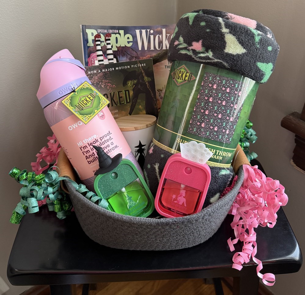 Defy gravity and unwind with this wickedly wonderful basket — perfect for any Wicked fan or book lover! This enchanting set includes everything you need for a cozy night in: Wicked Book – Dive into the spellbinding world of Elphaba and Glinda. Wicked Magazine – Full of special edition behind-the-scenes stories, interviews, and magical details about Wicked for good. Soft Blanket – Stay warm and comfortable as you read or rewatch your favorite musical moments. Wicked Bookmark – Keep your place in the story of Oz with this charming keepsake. Glinda special edition Owala Water Bottle – Stay hydrated while you relax — practical, stylish, and perfect for life on the go! Hand Sanitizers. Whether you’re a long-time fan of Wicked or new to the land of Oz, this basket is the ultimate combination of comfort, inspiration, and a little bit of magic.