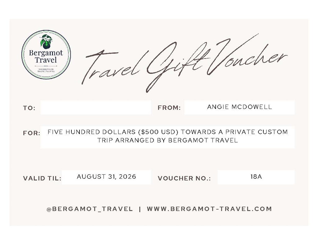 Stipulation: This travel voucher allows the bearer $500 USD to put towards a custom trip arranged and booked by Bergamot Travel. At Bergamot Travel, our mission is to build trusting relationships with our clients and create exceptional, bespoke, luxury trips. We are known for our incredible attention to detail, creativity, professionalism, personalized itineraries and our ‘guardian angel’ service while away on trips – we are always one step ahead. Travel is the #1 industry in the world. We at Bergamot Travel provide luxury travel experiences to our valued clients. As a Travel Edge affiliated company, we have access to one of the largest luxury travel networks of suppliers including hotels, resorts, cruise lines, on-site experience operators, as well as incredible connections all over the world to plan, create and execute the best travel experiences for our clients. Helping clients create wonderful lasting memories to cherish is the best feeling – this is why we are in business. Angie McDowell is the Director and Senior Luxury Travel Advisor/Designer at Bergamot Travel, a boutique agency specializing in crafting bespoke, “un-googleable” travel experiences. With a keen eye for detail and a commitment to personalized service, she has earned recognition as a Condé Nast Traveler Top Travel Specialist for 2023, 2024, and 2025. She travels extensively researching and experiences destinations, suppliers and services to ensure vetted offerings and first hand knowledge to clients. www.bergamot-travel.com