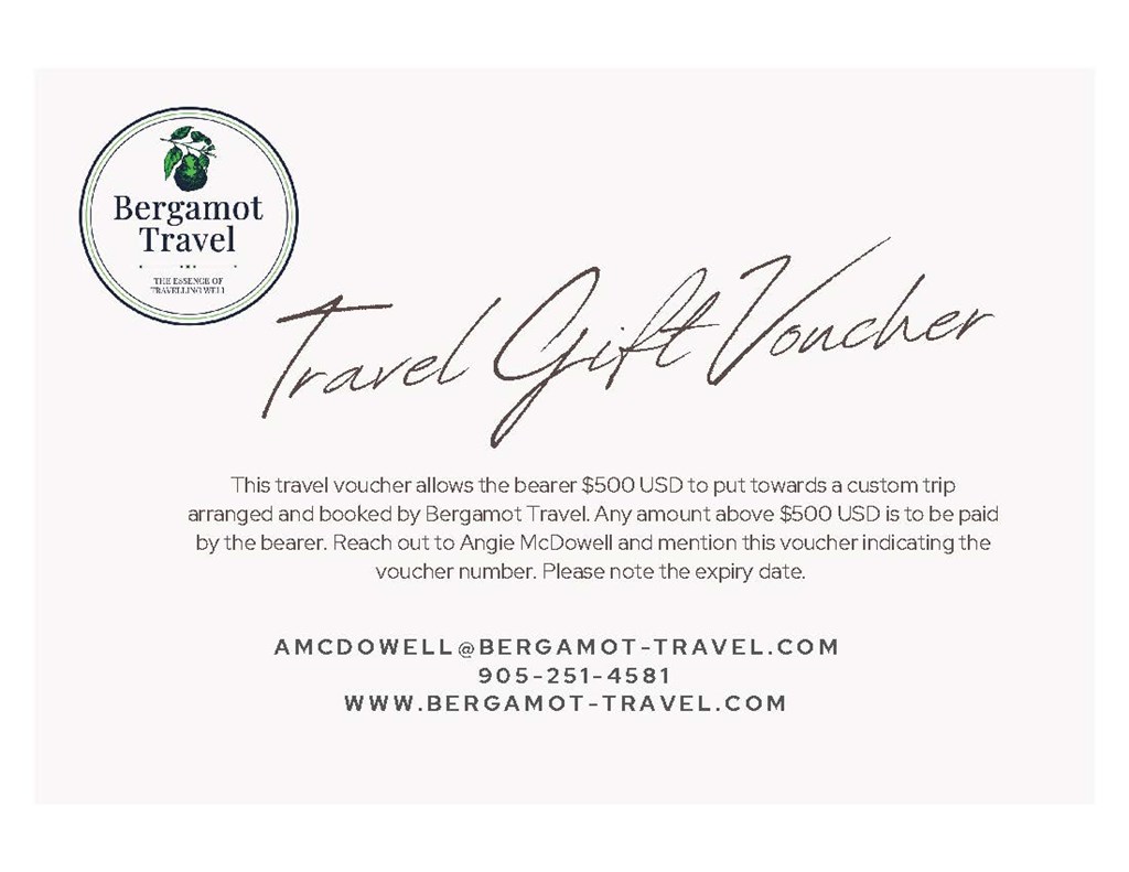 $500.00 Travel Voucher towards a booked trip through Bergamot Travel (see stipulation)